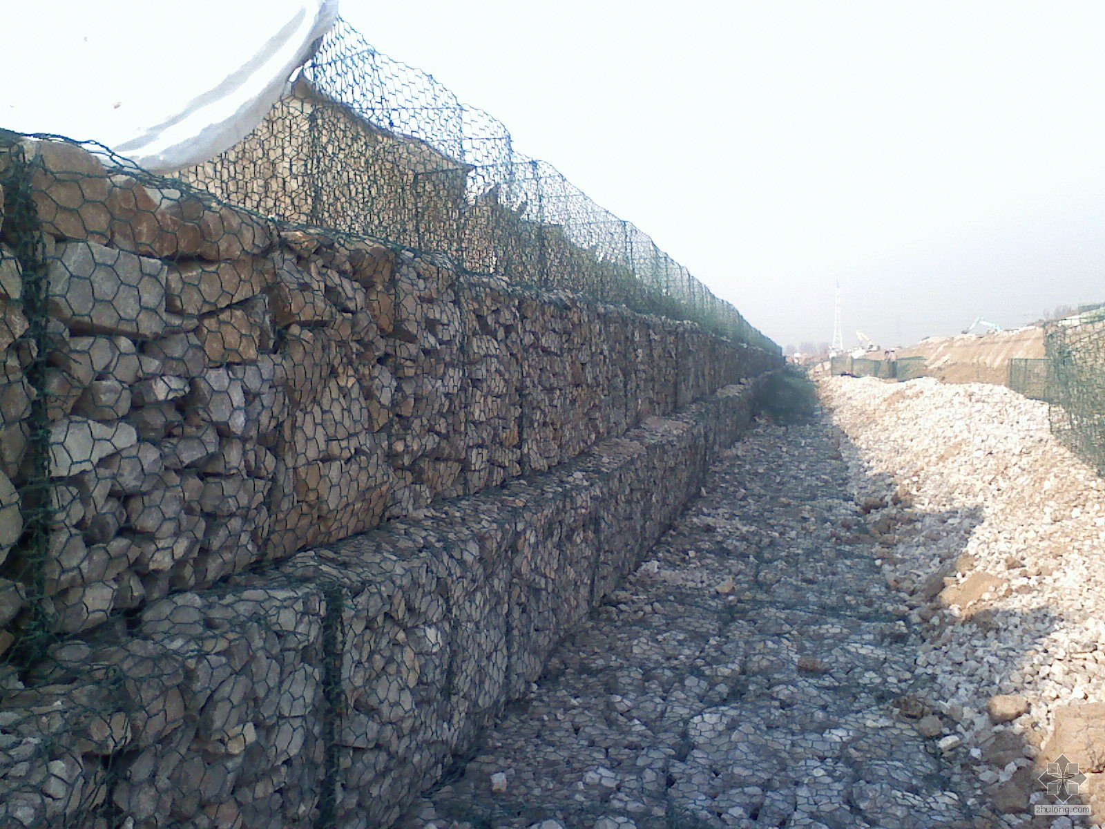 3、护垫石料填充。石料规格质量符合设计要求。严禁往单个网格内填入石料,同时均匀的向一组绿格的各网格内填入石料。填充石料可一次填满高度,空隙用小碎石填塞,应采取适当的捣实措施,以保证箱体内填充料的密实度。填充石料顶面宜适当高出护垫。填充石料的容重≥1.70t/mm